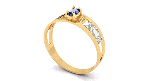 Anel em ouro de formatura psicologia, com simbolos em ouro amarelo e banho em ródio branco.