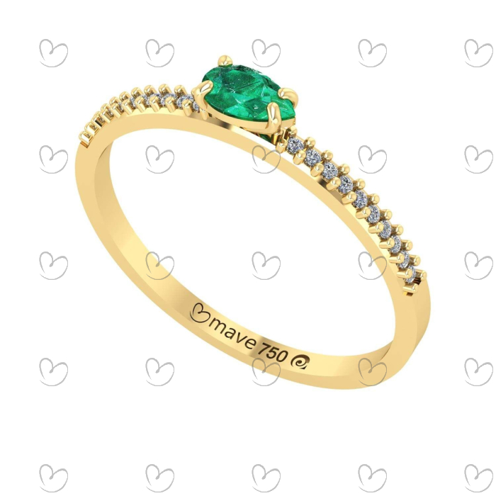 Anel Pedra Gota Lateral com Esmeralda e Diamantes Ouro 18k